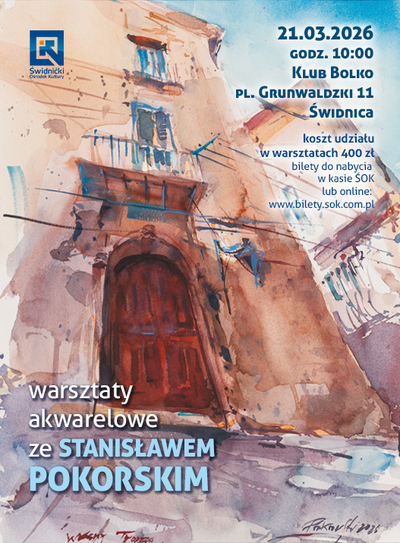 Świdnicki Ośrodek Kultury zaprasza na warsztaty akwarelowe ze Stanisławem Pokorskim – artystą, którego uczestnicy ubiegłorocznych Świdnickich Spotkań Akwarelowych mieli okazję poznać podczas plenerowego malowania. Akwarelista ujął wszystkich swoim charakterystycznym stylem, określanym jako „radosne malowanie”, a także charyzmą i niezwykłym poczuciem humoru. To właśnie na prośbę osób, które miały okazję pracować ze Stanisławem Pokorskim, Świdnicki Ośrodek Kultury ponownie zaprasza Państwa na te wyjątkowe warsztaty.